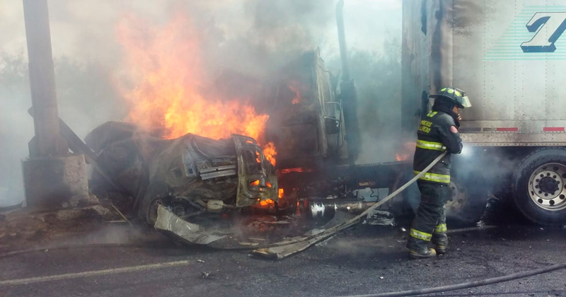 Un vehículo se estrella contra un tráiler y ambas unidades se incendian, sólo el chofer de la pesada unidad logra salvarse