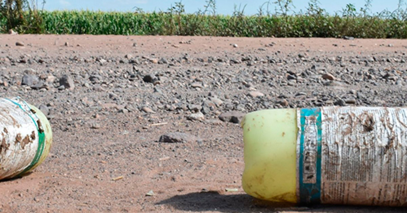 Botellas vacías de plástico que contenían agroquímicos son tirados al intemperie en tierras de cultivo en Tamaulipas, lo cual representa un foco de contaminación latente