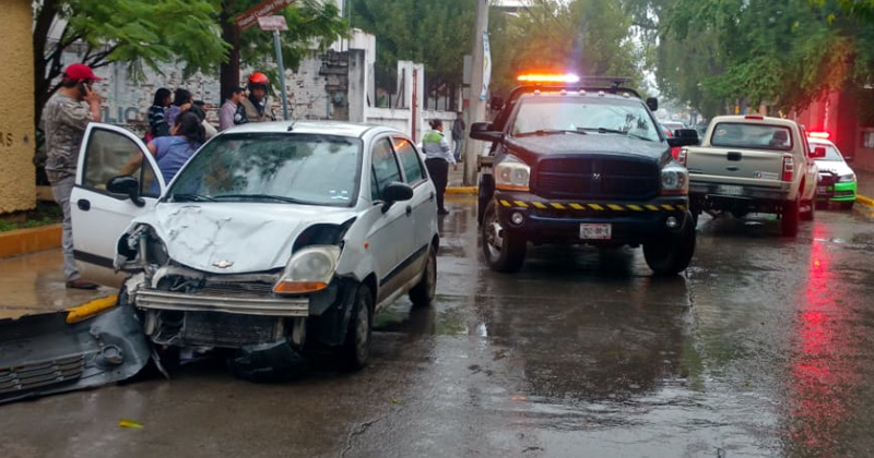 Chofer de un coche compacto no respetó un alto obligatorio y se estampa con una camioneta a la cual hace girar.