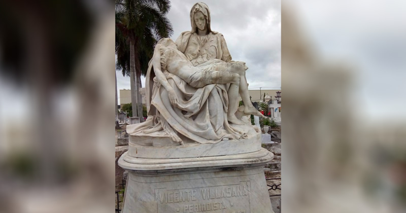 La escultura hecha en una sola pieza de mármol de carrara está al pie de la tumba del periodista Vicente Villasana.