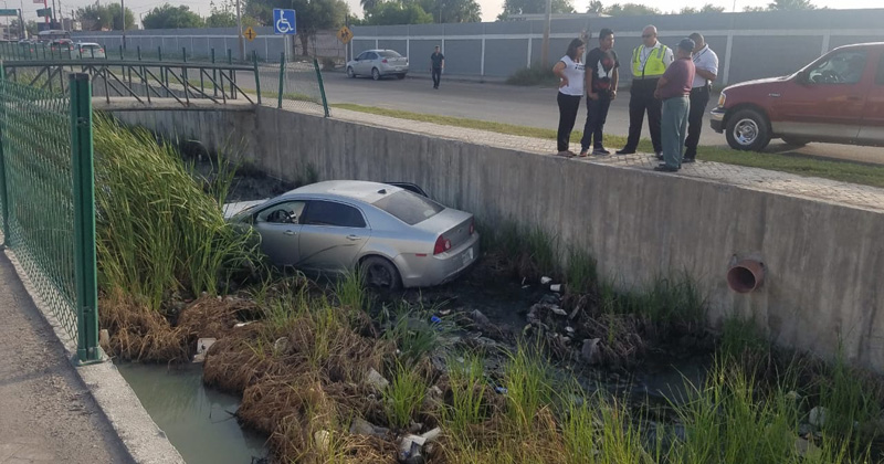 Fue a las 8:05 horas que se registró el accidente en el que un vehículo compacto, marca Chevrolet tipo Malibu, modelo 2012, color gris, placas de Texas, terminó entre las hierbas y basura del dren de aguas negras.