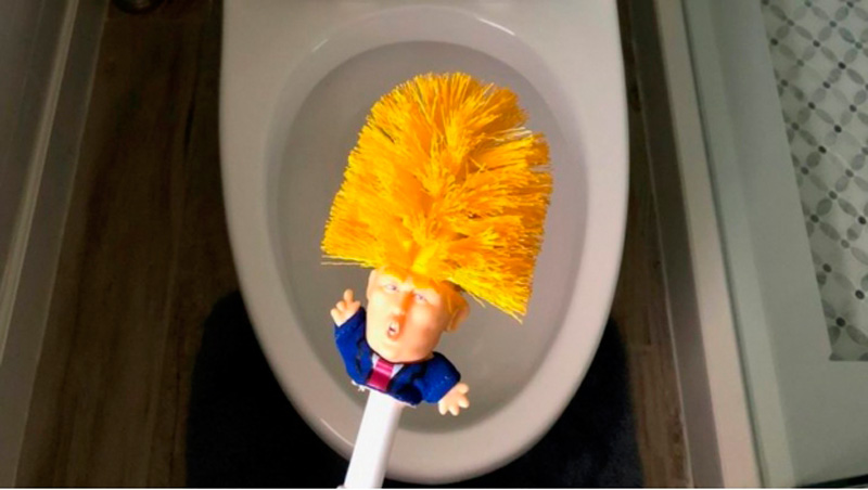 Lanzan cepillo para fregar taza de baño con rostro de Trump