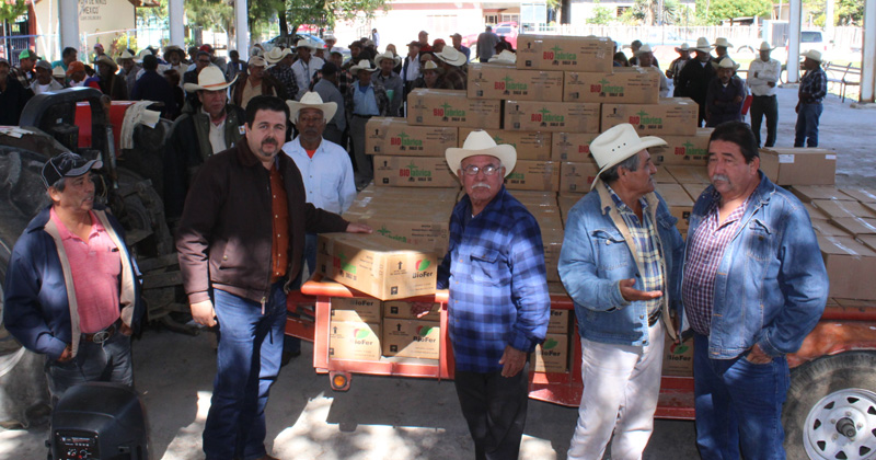 El líder de los citricultores de Guémez, Barrón Tovar, dijo que en el ejido Guadalupe Victoria se realizó la entrega de 5 toneladas de fertilizante líquido y en polvo, para 160 productores.