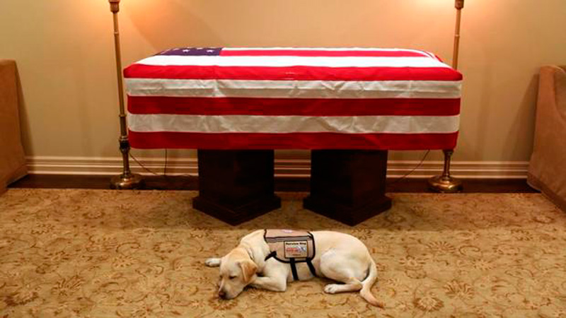 En una fotografía Sully aparece tendido en el suelo junto al ataúd de Bush cubierto con una bandera estadounidense.