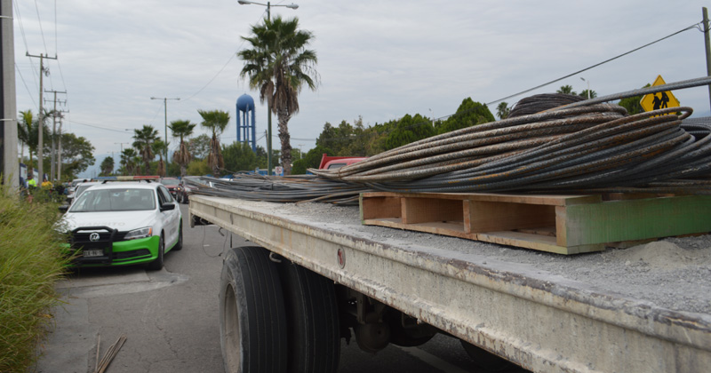 Camión de plataforma olvida asegurar el material de construcción y, por la inercia salen disparadas, para terminar golpeando el automóvil de una ama de casa