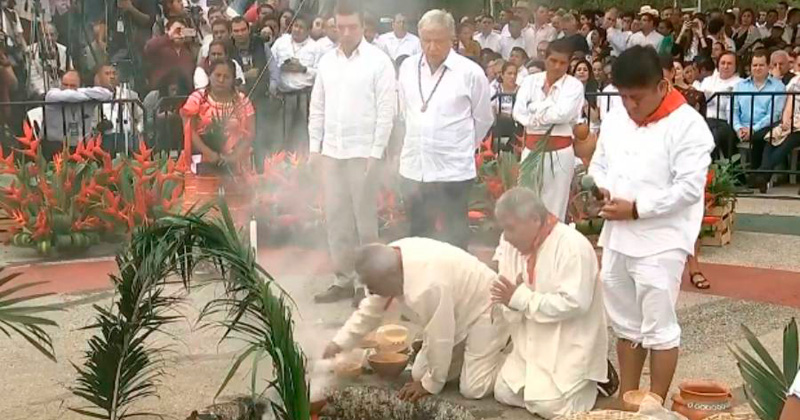 AMLO fue partícipe de la ceremonia que comenzó con una oración de integrantes de los pueblos indígenas para pedir permiso a la Madre Tierra para dar comienzo a la obra del nuevo gobierno