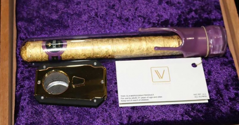 Un cigarro hecho con 24 gramos flores de mariguana, envuelto en hojas de oro de 24 quilates, colocado en una fina caja de madera y terciopelo, fue pagado en efectivo con billetes de 20 dólares.
