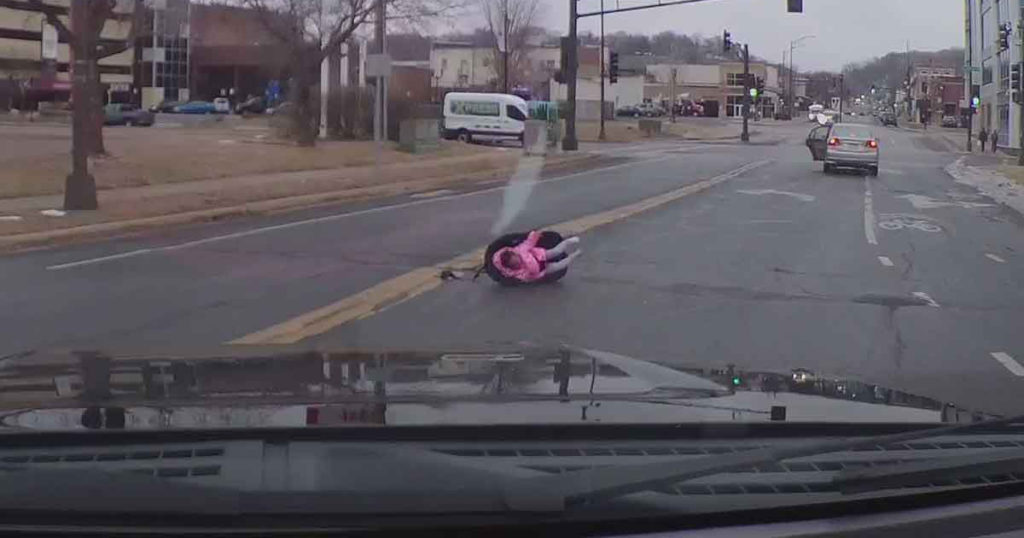 Sucedió en una calle de Mankato, en Minessota, cuando Chad Chedar grabó el instante cuando del vehículo de adelante cae un pequeño con todo y su silla para bebé.
