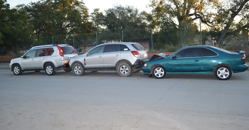 Dos camionetas ‘cerradas’ se frenan correctamente para evitar golpear a un Neón que perdió un neumático… pero llega un cuarto auto y choca ambas trocas