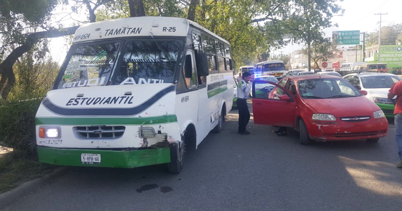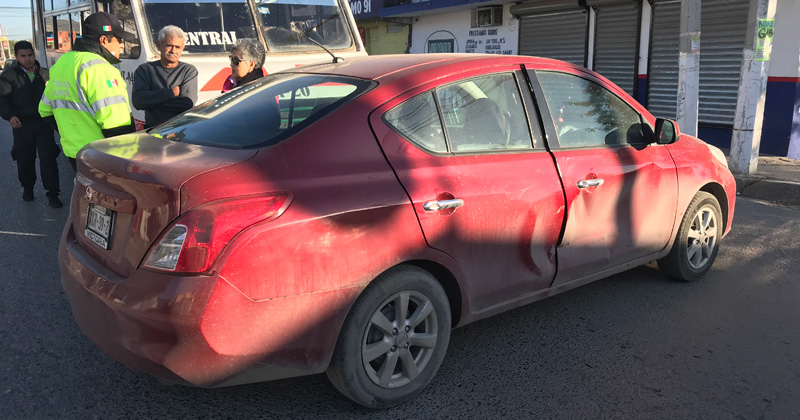 Microbusero se avienta ‘como El Borras’ después de subir pasaje en el 8 y 9 Bulevar Praxedis Balboa, pero por un mal cálculo le pega a un Aveo que esperaba su luz