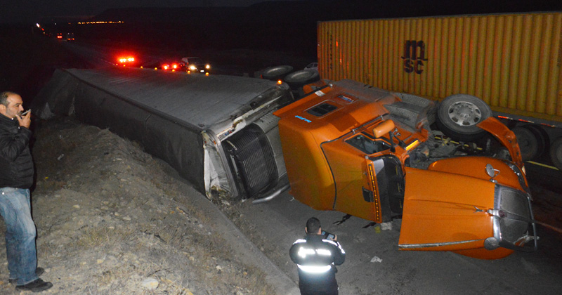 Trailero prefiere costalear su unidad en vez de chocar de frente con vehículo similar que venía invadiendo carril al rebasar en la carretera a Zaragoza