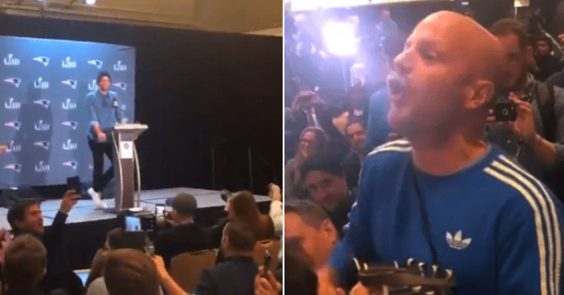 El comediante Facundo asistió a una conferencia con su Ukelele para cantar «We are the champions» de Queen al mariscal de campo de los Patriotas Tom Brady.
