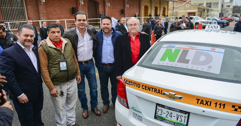 El alcalde Enrique Rivas, junto con el secretario estatal de Turismo, Fernando Olivera, encabezaron la instalación de microperforados en taxis para brindar mayor confianza en los usuarios.