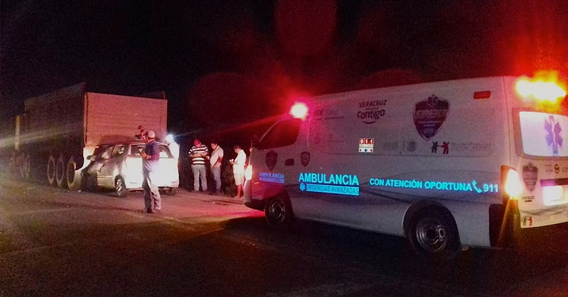 Debajo de la caja del trailer y totalmente destrozado de su parte frontal terminó el auto compacto.