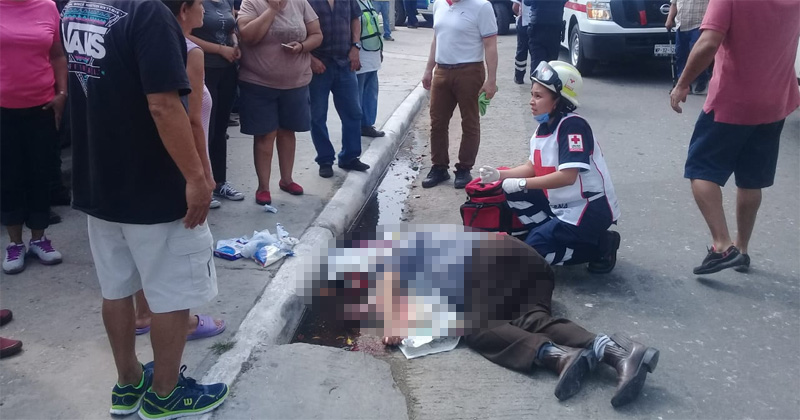 Policías estatales le aplicaron los primeros auxilios al pasajero, luego de que cayera brutalmente de la unidad. El chofer quedó detenido a disposición de la autoridad que lo reclama