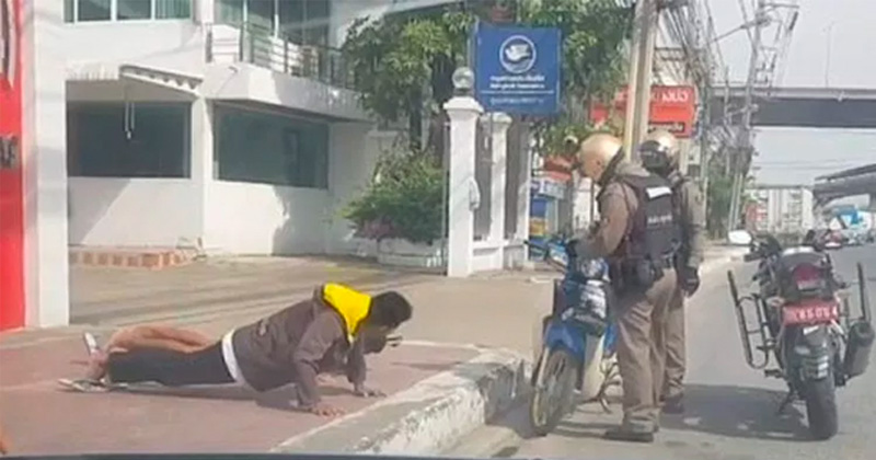 Al no poder pagar la multa por andar en motocicleta sin casco, policías tailandeses decidieron poner a dos jóvenes a hacer lagartijas.