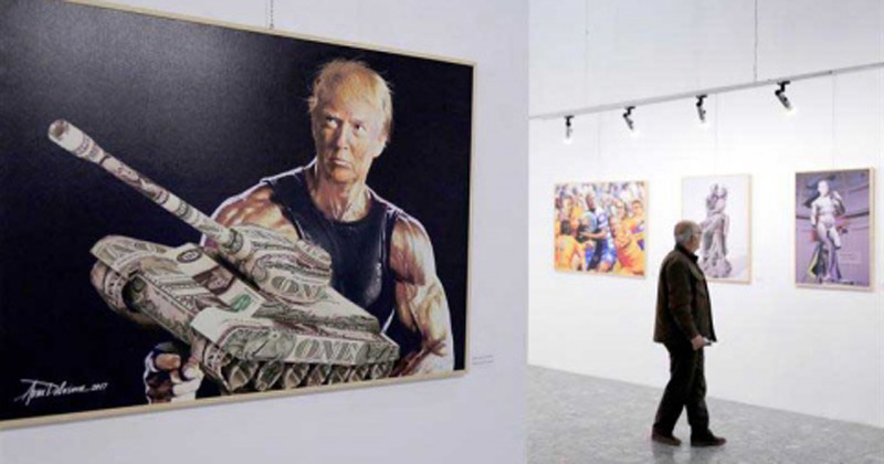 El artista albanés Avni Delvina presenta la muestra ‘The Donald’, una oda al mandatario estadunidense en la que es representado como Jesucristo crucificado o Rambo.