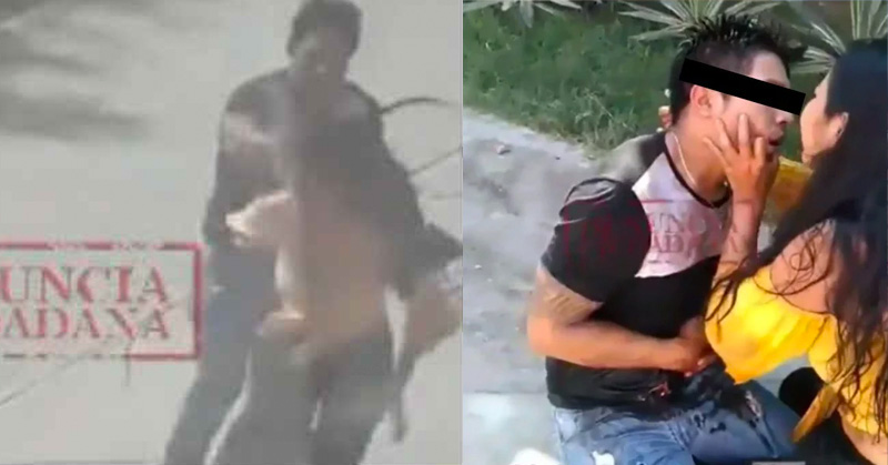 Se puede ver a la mujer pidiendo ayuda de manera agresiva, luego vuelve a lastimar a su novio el cual sale corriendo huyendo de ella