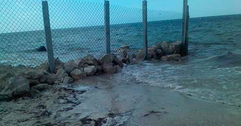 La malla metálica, con alambre y vigas se extendía adentro del mar.