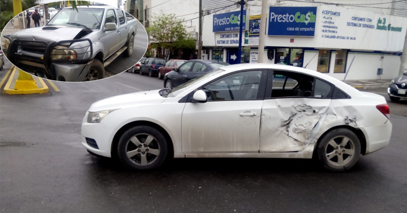 Fuerte trancazo provocó una mujer al volante a bordo de una pick up al no respetar el señalamiento del 16 Sonora causando cuantiosos daños materiales.