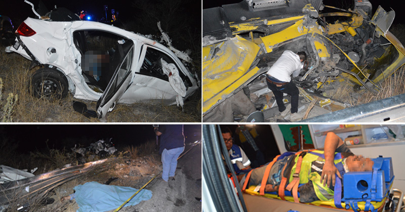 Dos personas perdieron la vida prensados en el interior de un Aveo al chocar de frente contra la unidad de carga que les invadió carril en el kilómetro 34 de la carretera a Rumbo Nuevo.