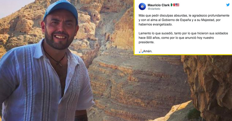 CIUDAD DE MÉXICO.- El conductor Mauricio Clark, quien se acercó al cristianismo para “dejar atrás su homosexualidad”, publicó en su cuenta de Twitter un agradecimiento España por haber evangelizado el territorio de lo que hoy es México tras el periodo de la conquista.