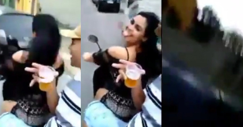 Mientras con una mano sostiene una bebida, al parecer cerveza, con la otra graba el video