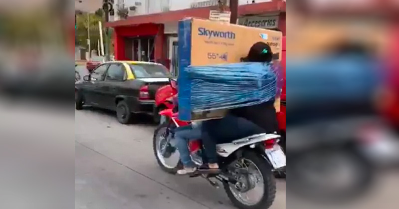 Hombre se pega una pantalla en los brazos para poder llevársela en la moto