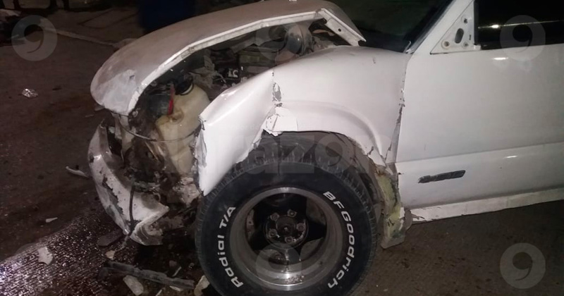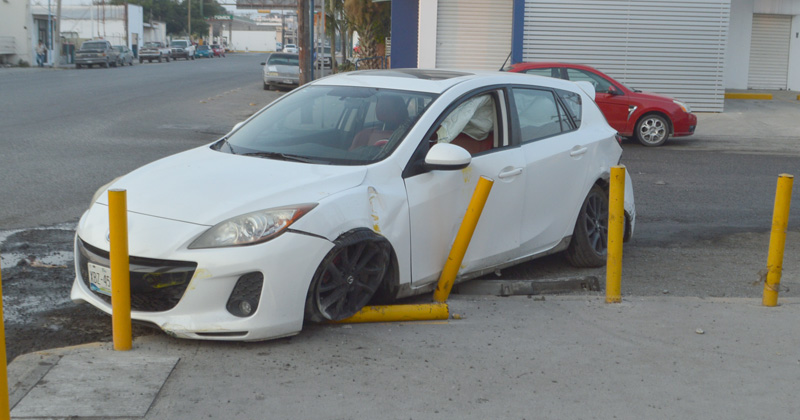 Rebota en las contenciones de una tienda luego de ser impactado por una camioneta en el 8 Aldama y todo por no hacer alto como lo ordena el disco