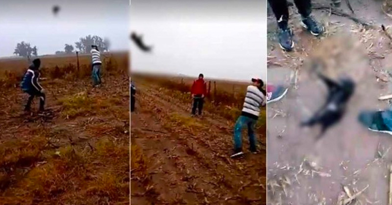 La cuenta de Twitter Prensa Animal publicó las fotografías de al menos tres hombres que aparecen en un campo, y un perrito de color negro vuela por los aires, en tanto uno de los involucrados sujeta un palo, como bate, para golpear a la mascota.