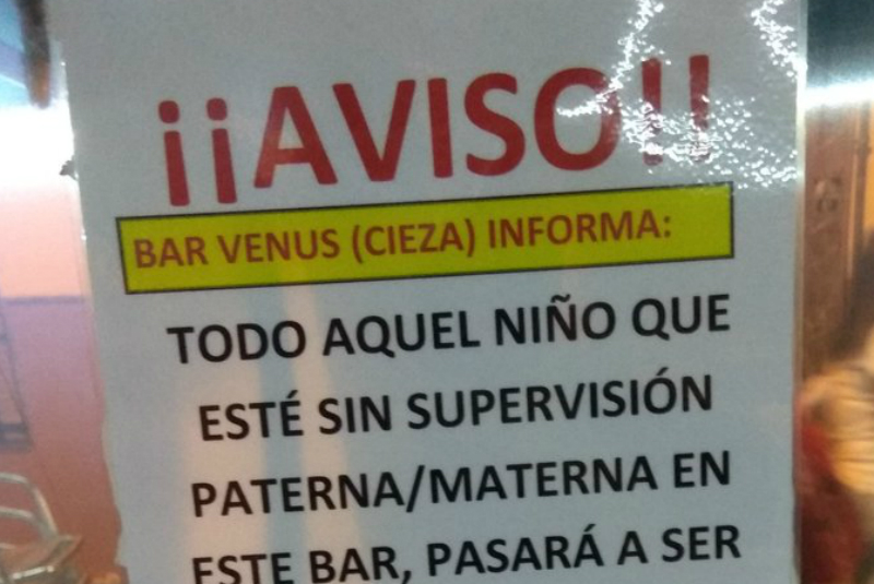 «Todo aquel niño que esté sin supervisión materna o paterna en este bar pasará a ser propiedad del bar» dice el mensaje