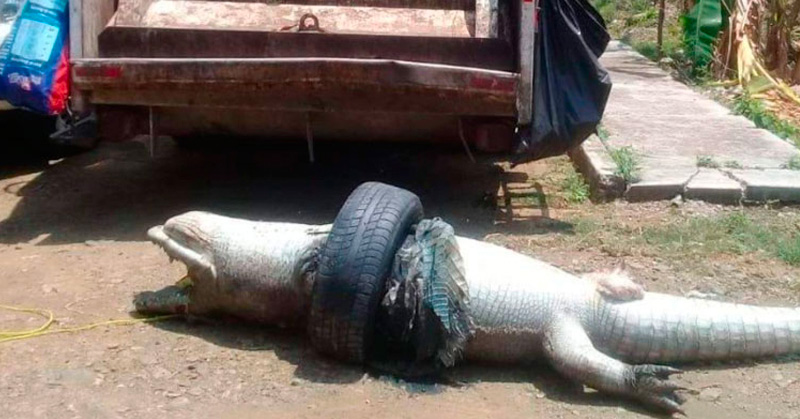 Encuentran a cocodrilo asfixiado por una llanta en Tuxpan
