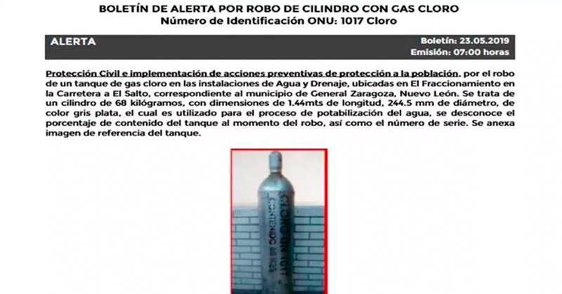 Alertan en Nuevo León por robo de cilindro con gas cloro