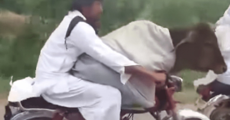 En el video se puede apreciar como la vaca viaja en motocicleta cubierta con una tela gris, el hecho causa risas