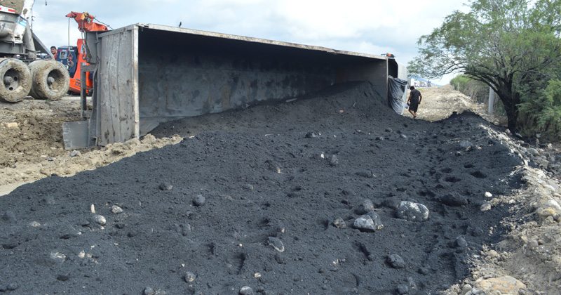 Trailer vuelca cuando viajaba hacia la frontera a dejar su carga de mineral, sin embargo no se pudo localizar al chofer o acompañante para explicar las causas del accidente.