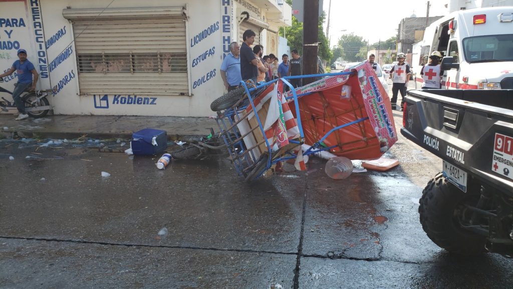 Camioneta estaquitas intenta pelarse después de pegarle a un Bora en el 8 Hidalgo pero en su ruta de escape termina por llevarse de corbata a un vendedor a bordo de su moto-triciclo