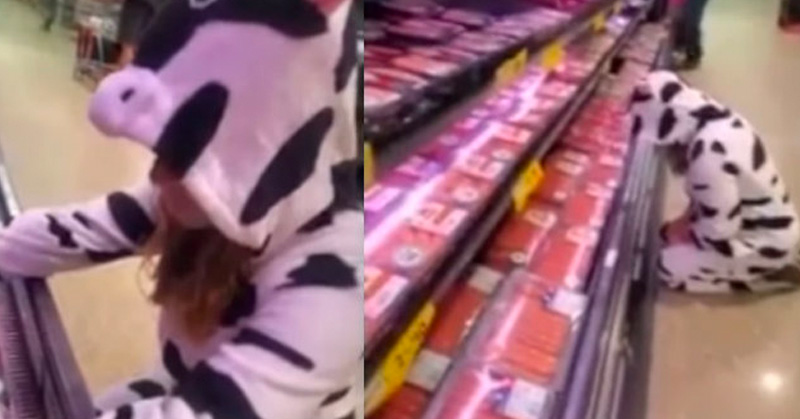 Vegana disfrazada de vaca le llora a carnes congeladas de supermercado