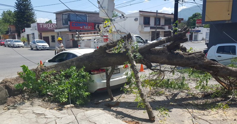 CIUDAD VICTORIA, TAMAULIPAS.- Fuertes ráfagas de viento que se registraron la tarde de este domingo dañaron dos vehículos y además dejaron sin luz eléctrica una manzana por varias horas.