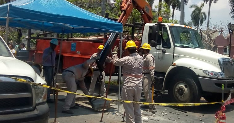 Personal de la Comisión Federal de Electricidad realiza los trabajos para reponer una pieza dañada de un transformador en la calle peatonal Díaz Mirón de Tampico.