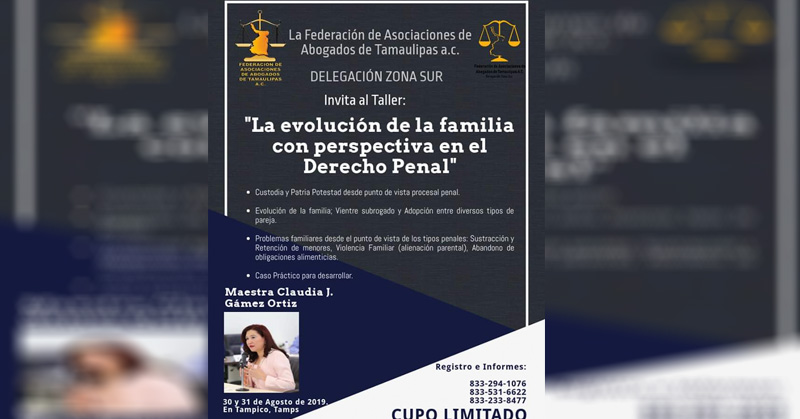 El taller es organizado por la federación de Asociaciones de Abogados de Tamaulipas A.C. en la zona sur.