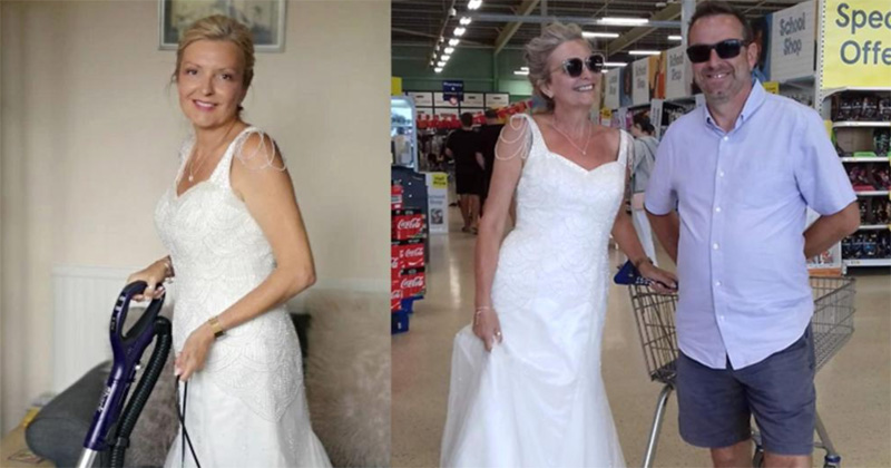Dawn Winfield-Hunt, que vive en la isla de Wight en Reino Unido, se casó el mes pasado con su novio Steve. Desde entonces, ha estado usando su vestido de novia cada que puede, en casa, para limpiar o hasta para salir de compras.