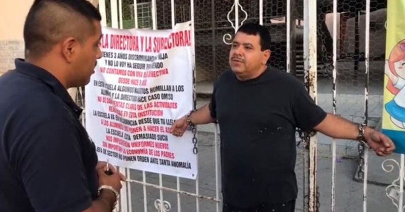 Se encadena padre en portón de escuela por bullying que recibe su hija