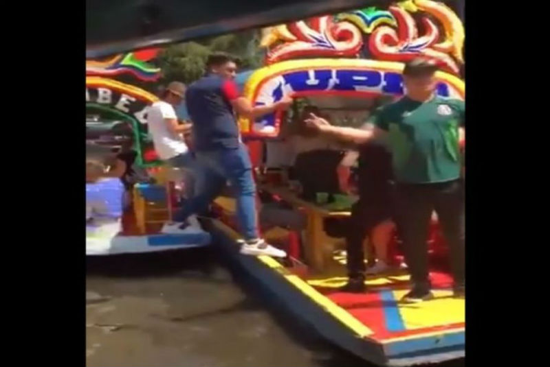 En la grabación se aprecia cómo un grupo de jóvenes disfrutan de la música a bordo de las trajineras, sin embargo, momentos después se observa que un joven cae