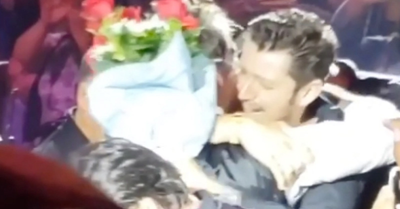 Alejandro Fernández recibe flores de un hombre en pleno concierto