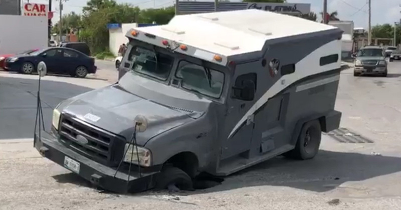 Cae camión de valores a socavón en Matamoros