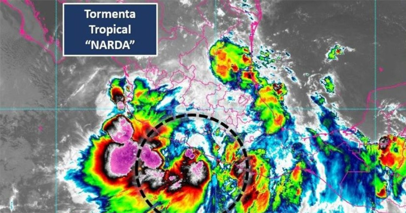 Fue este sábado por la noche, aproximadamente a las 22:00 horas cuando se formó la tormenta tropical Narda, que de acuerdo con Conagua, se localiza a 185 kilómetros al sur-suroeste de Acapulco, Guerrero, con vientos máximos sostenidos de 65 kilómetros por hora, rachas de 85 km/h y desplazamiento hacia el noroeste a 15 km/h, en paralelo a costas del Pacífico Central de México.