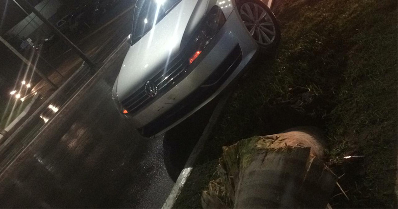 Automovilista perdió el control del volante al desplazarse a exceso de velocidad ante el pavimento mojado y se proyecta en contra de una palmera a la que derribó, por fortuna él resultó ileso.