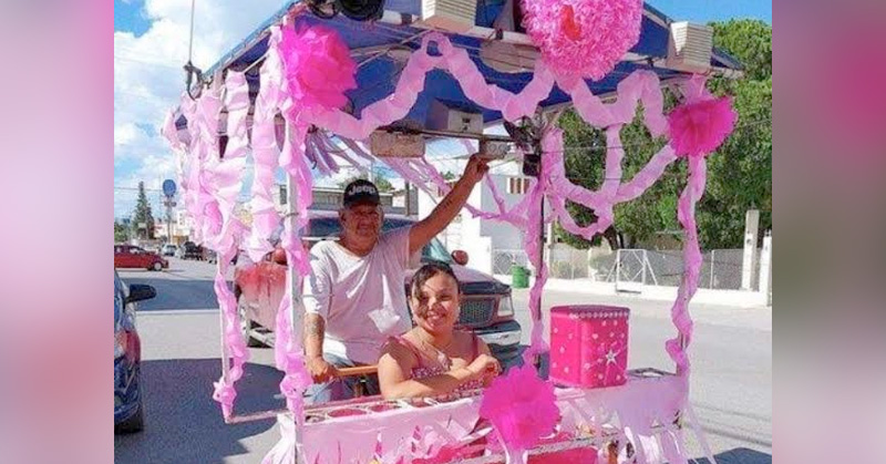 Vendedor de raspados pasea a su hija en triciclo por sus 15 años
