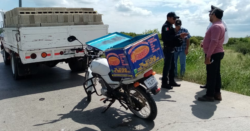 Un repartidor de un negocio de pollos protagonizó dramático percance al impactarse contra un camión materialista cargado de blocks, resultando severamente lesionado.