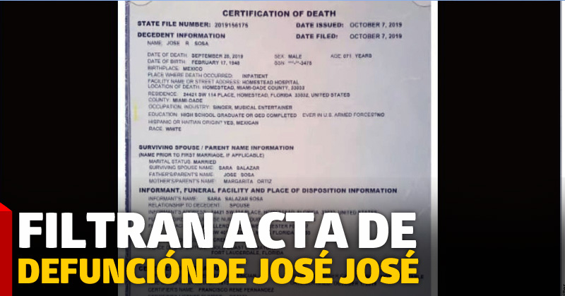 Un Nuevo Día, de Telemundo aseguró que el documento da constancia de la muerte de «El Príncipe de la Canción», en el que se lee que murió en el Homestead Hospital y no en un hospicio, como había informado la compositora Lolita de la Colina
